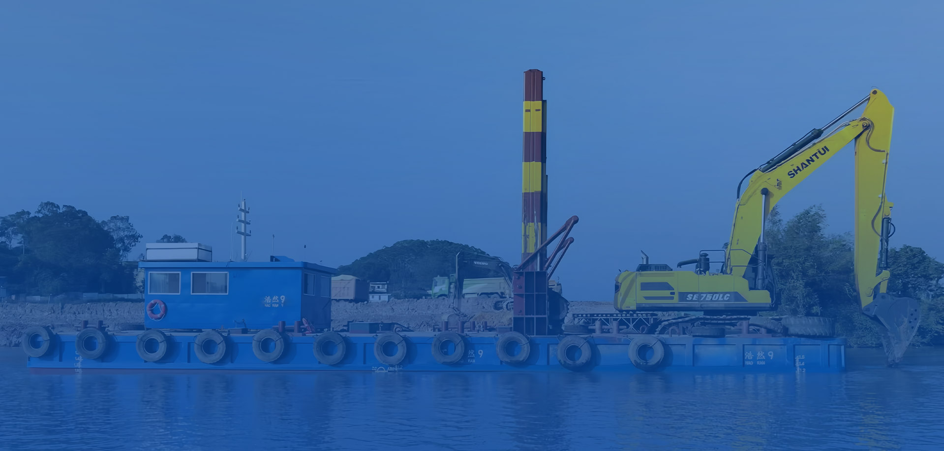 2、施工平臺(tái)穩(wěn)性強(qiáng),方便挖掘機(jī)在深水區(qū)施工作業(yè)。并且,平臺(tái)自帶航行動(dòng)力,便于水上調(diào)遣。